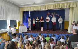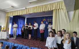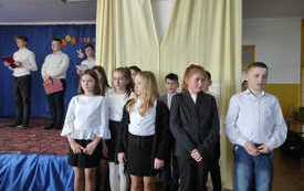 Dopełnieniem świątecznego klimatu, jaki od kilku dni panował w naszej szkole, był występ przedstawicieli Samorządu Uczniowskiego pod kierunkiem pani Zofii Gietka. Starsi koledzy przybliżyli nam symbolikę Świąt Wielkanocnych, przypomnieli zwyczaje związane z tym czasem oraz złożyli wszystkim obecnym i ich rodzinom życzenia świąteczne. Występ uświetnił śpiew uczniów klasy czwartej do gitarowego akompaniamentu ks. Michała Turbaczewskiego.